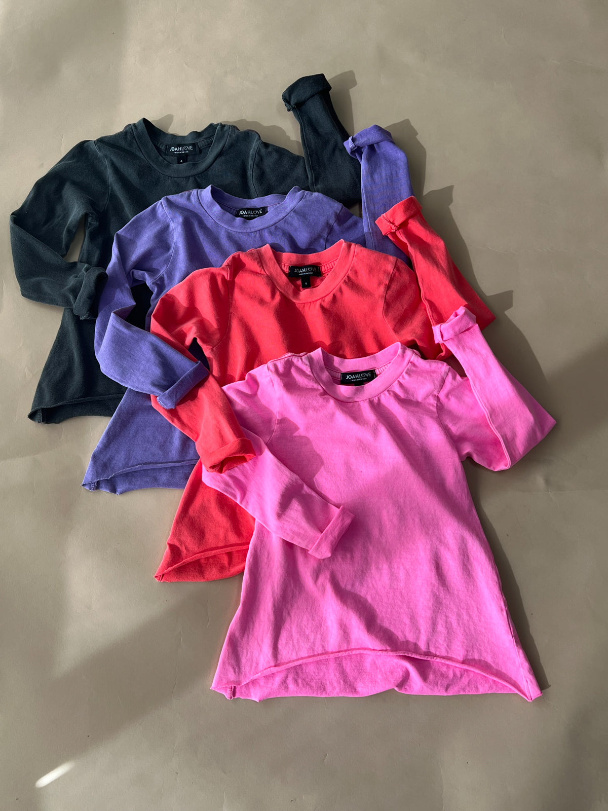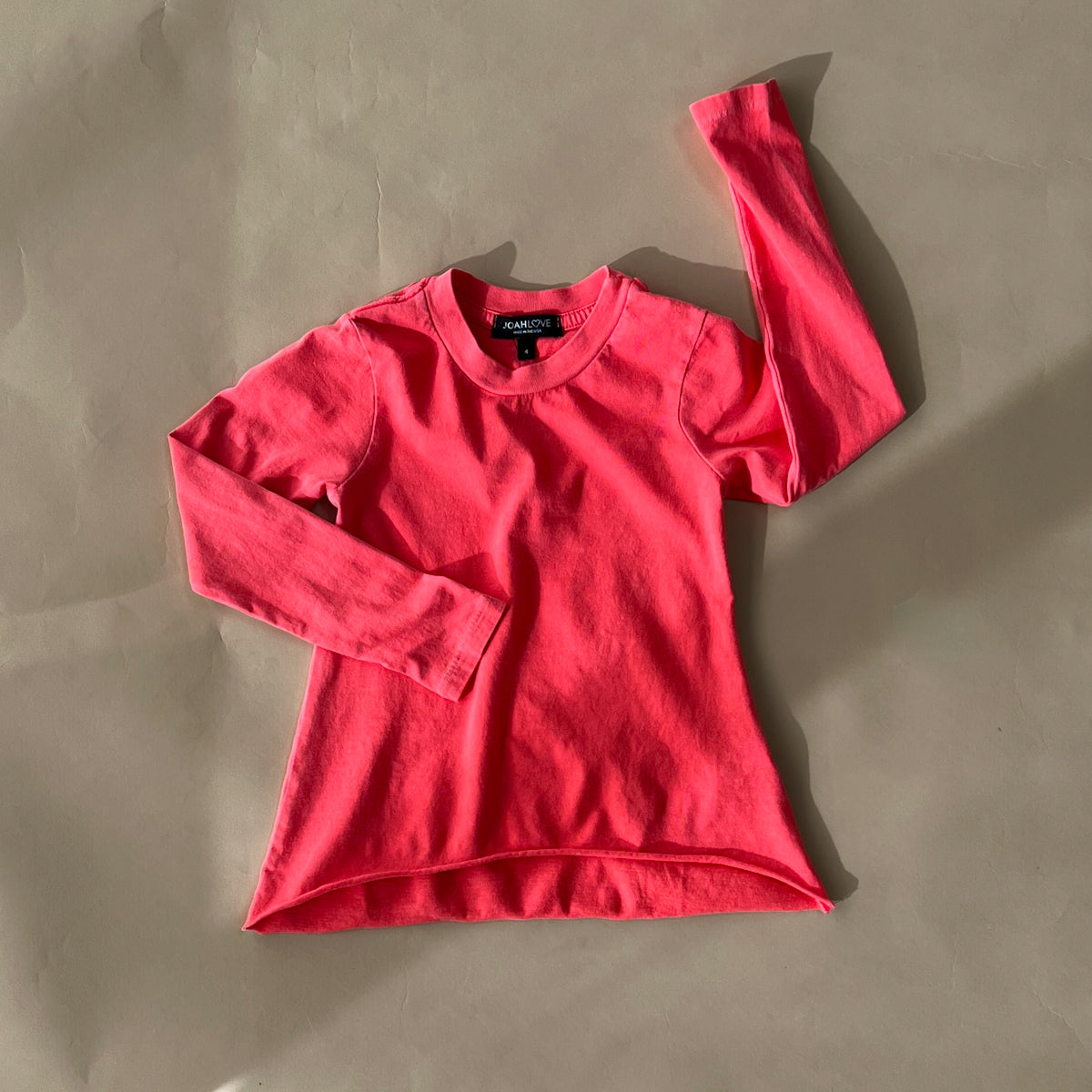 • Our signature long sleeve girls tee with slightly flared raw edge hem.