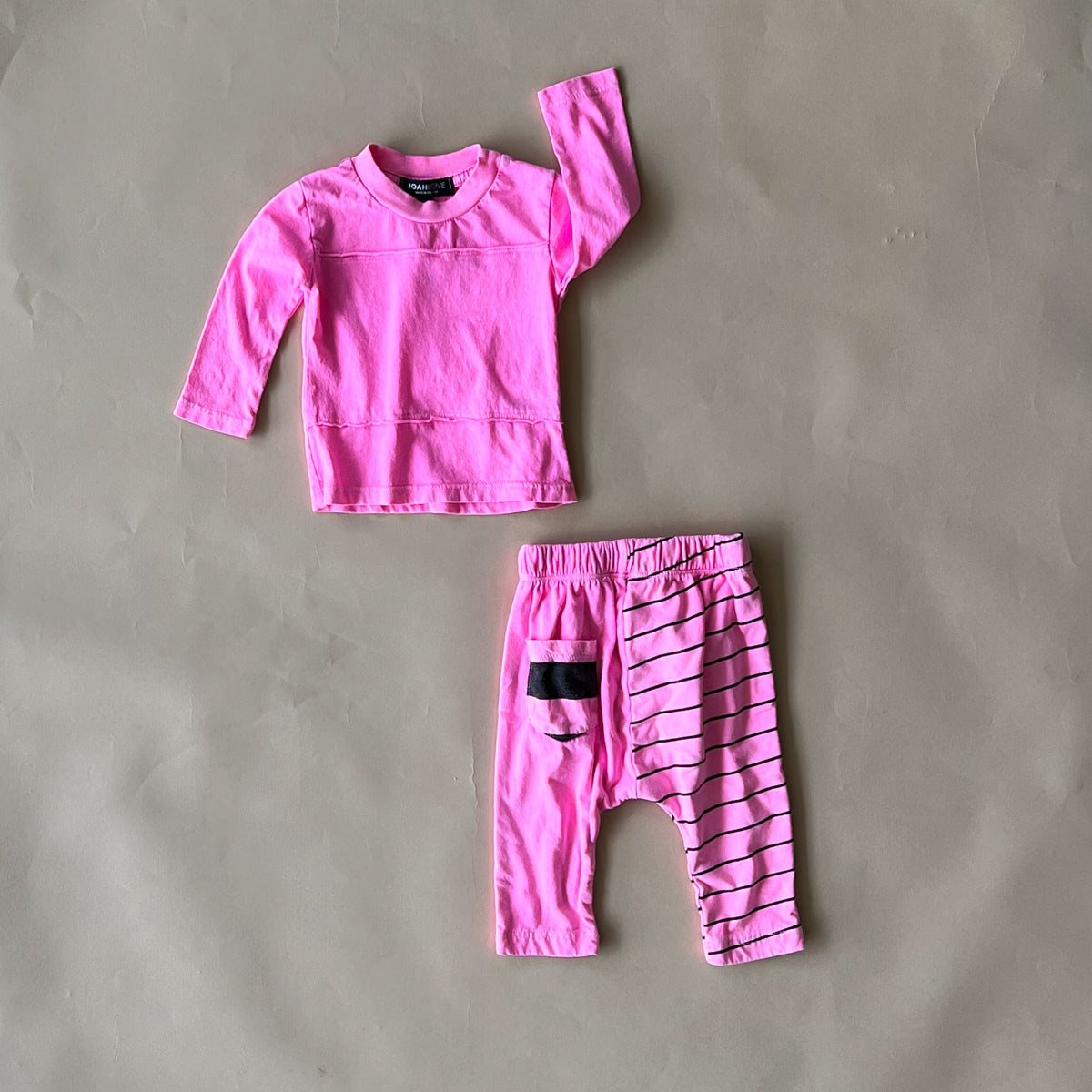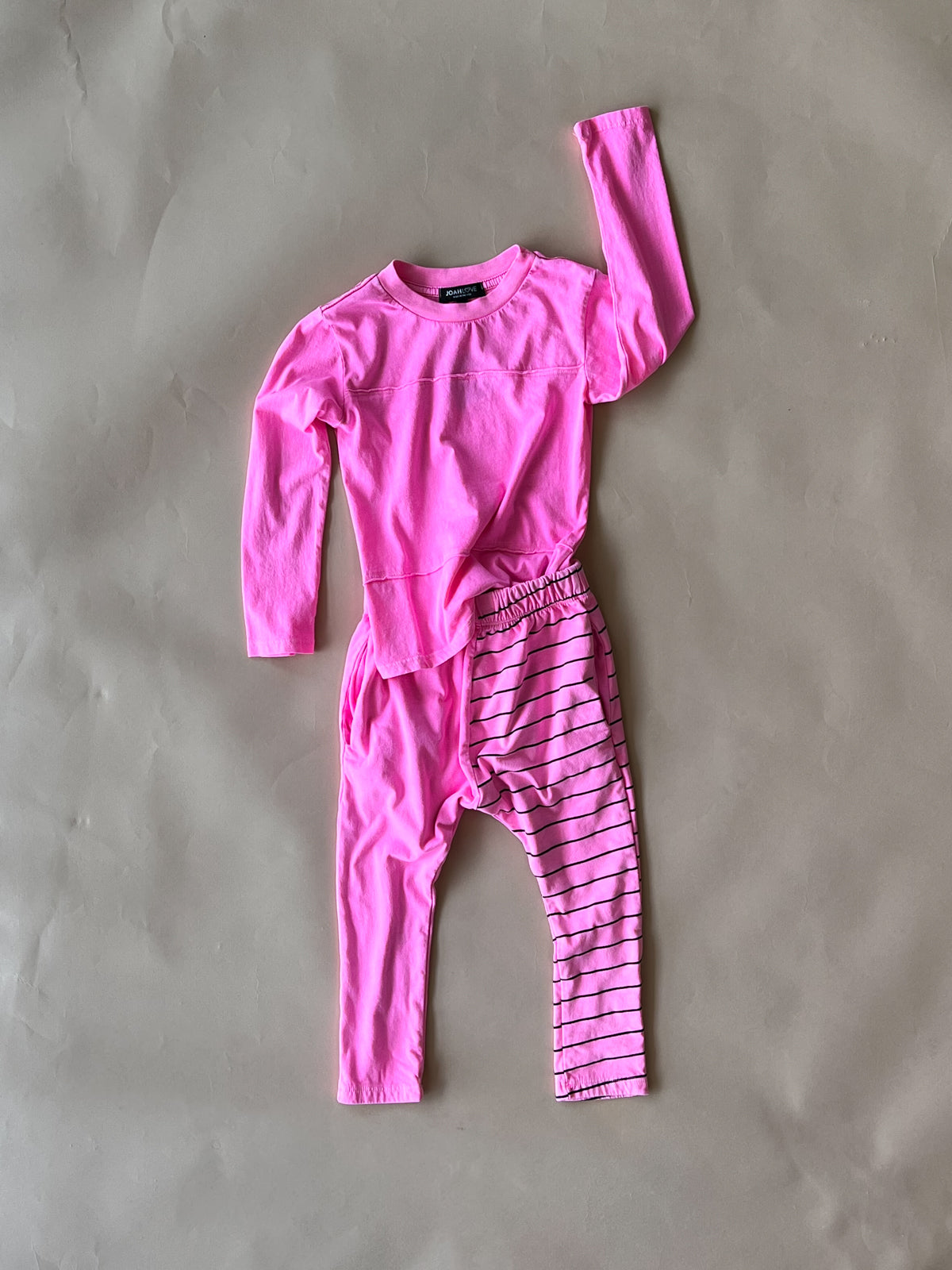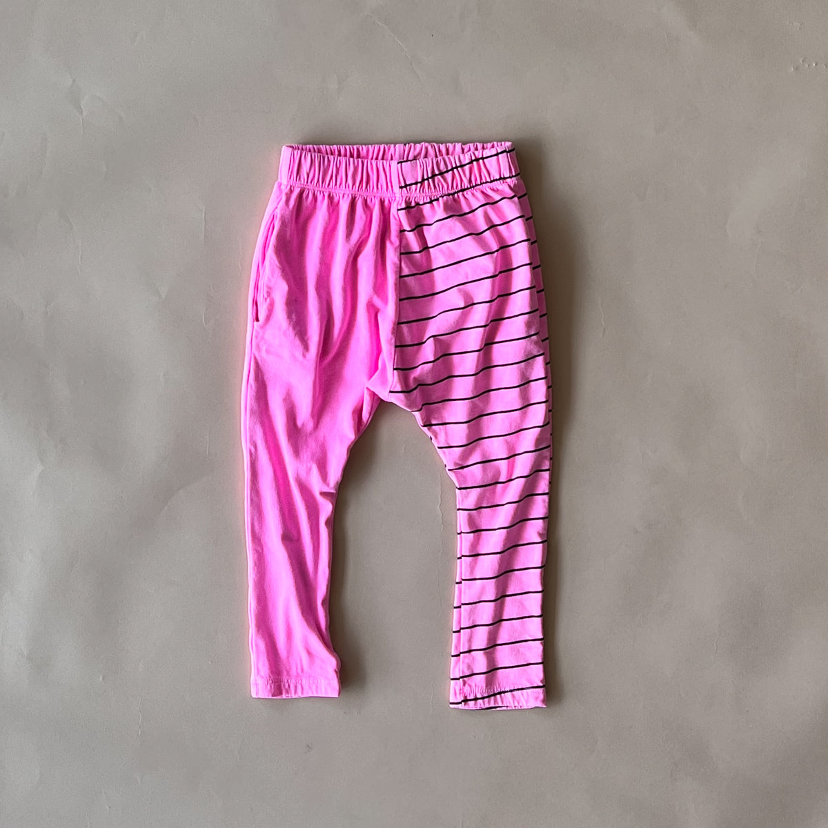 Soft cotton solid jersey on one leg, pinstripe jersey on the other.