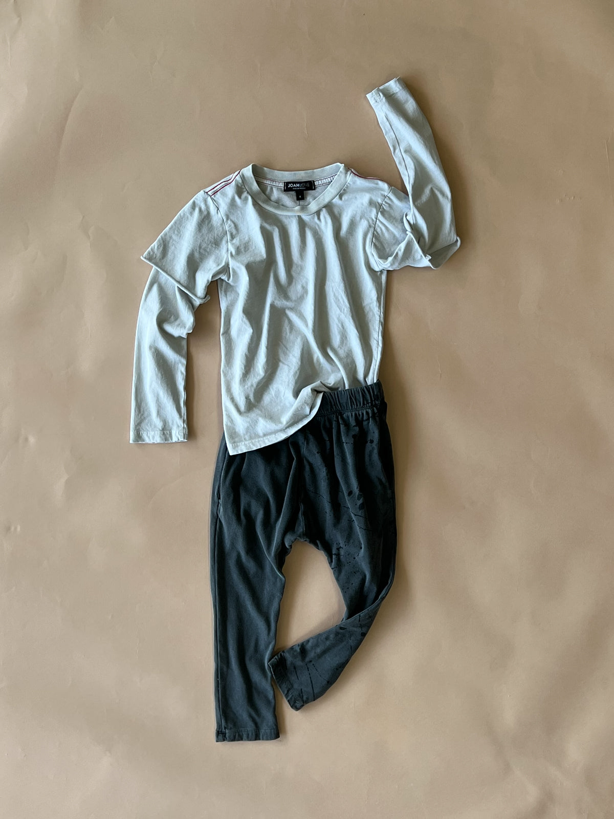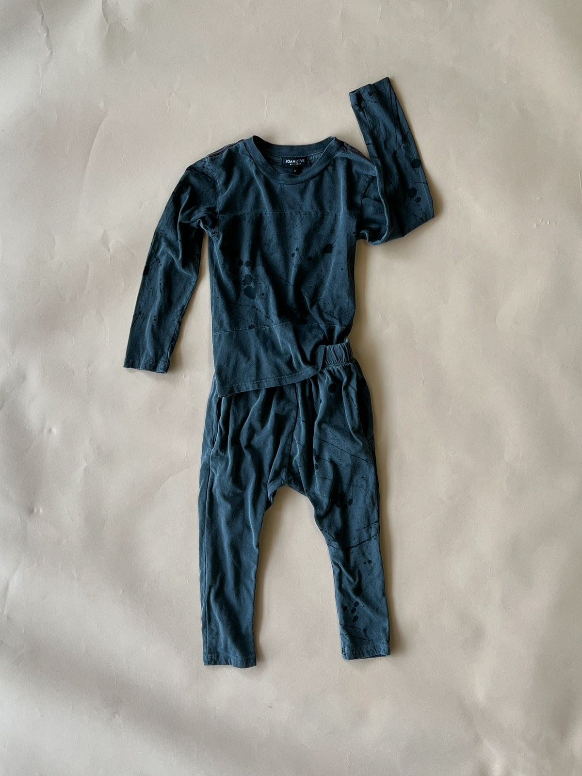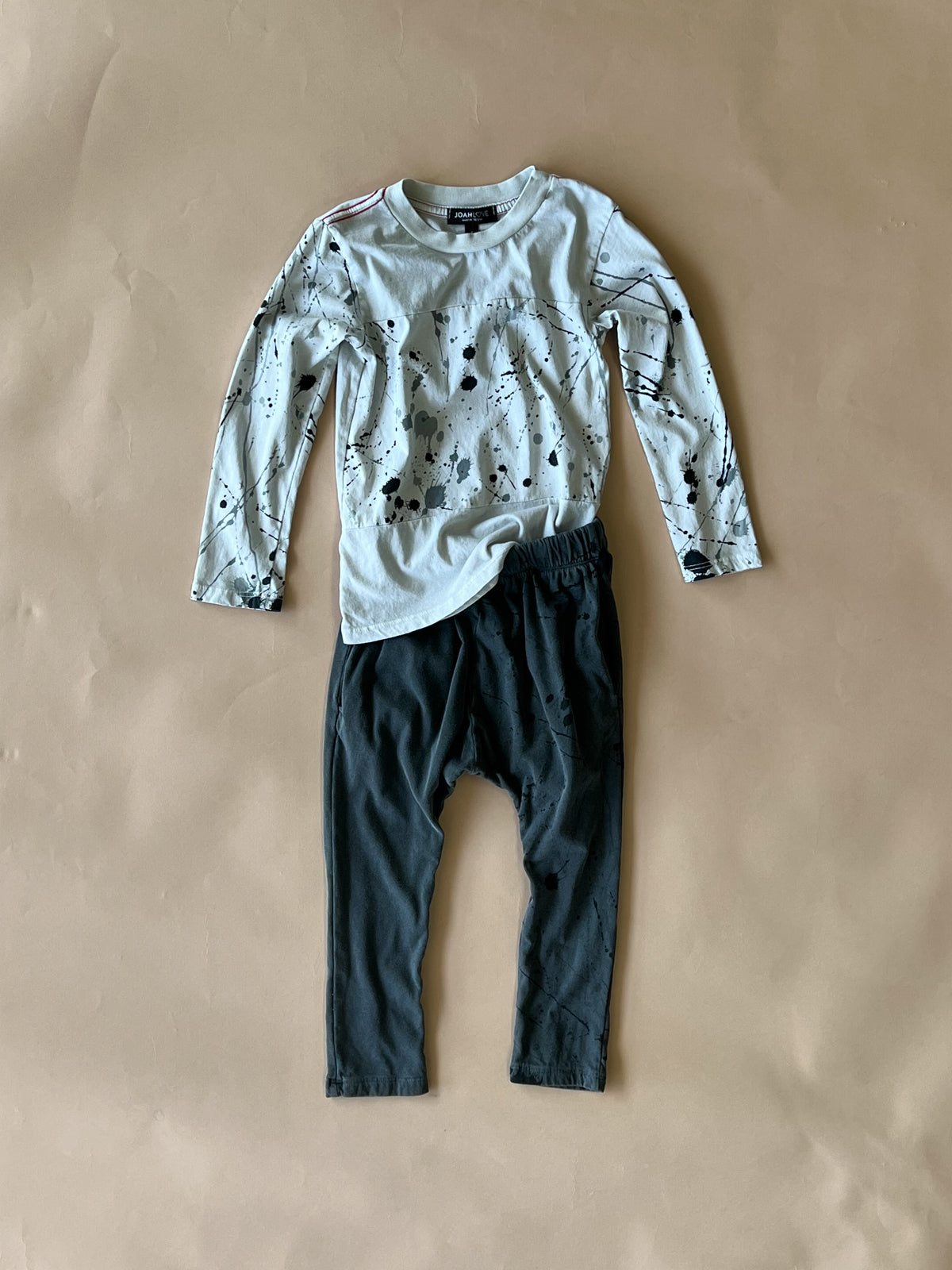 • Soft cotton solid jersey on one leg, splatter print jersey on the other.