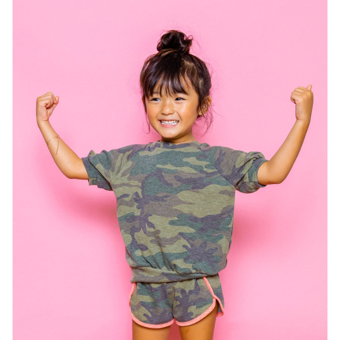 Non brushed, light weight, faux cashmere, camouflaged top with puffed sleeves, a gathered waist and crew neck in kids + adult sizes!