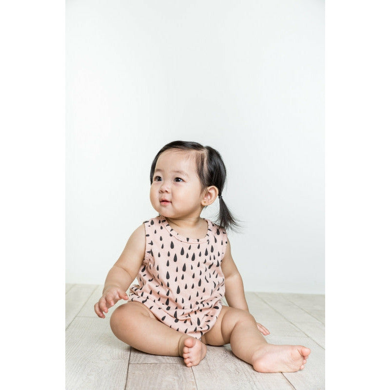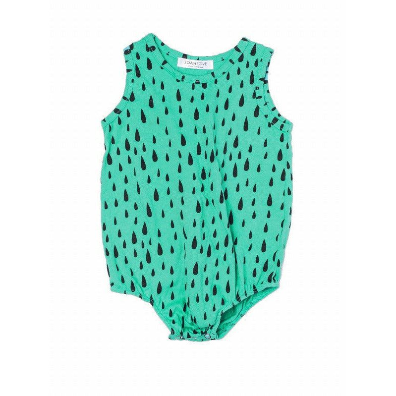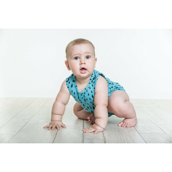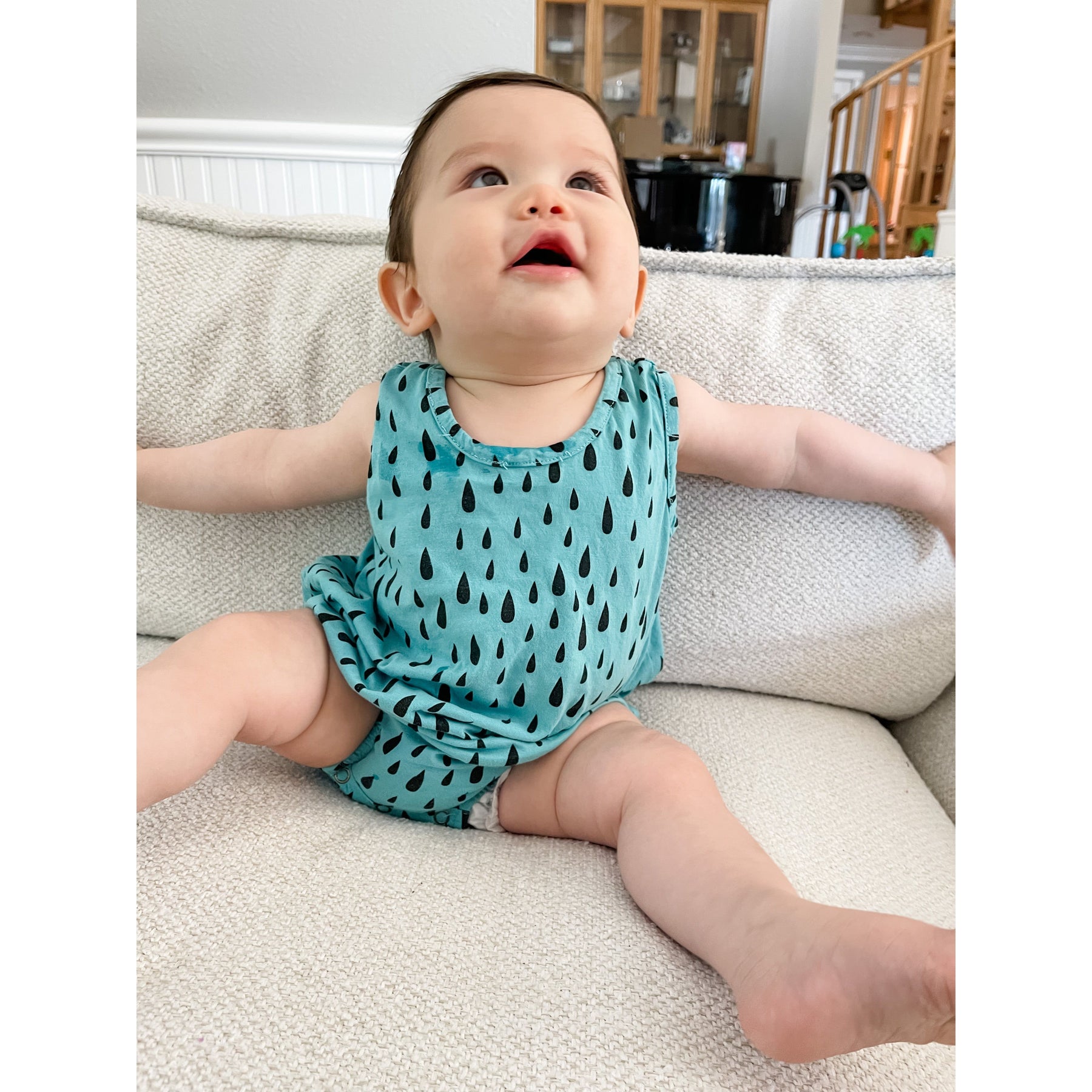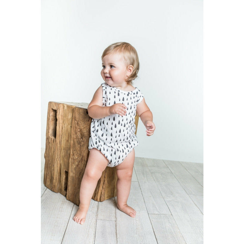 Rain drops print baby funsuit. Preshrunk. Made in the beautiful USA.